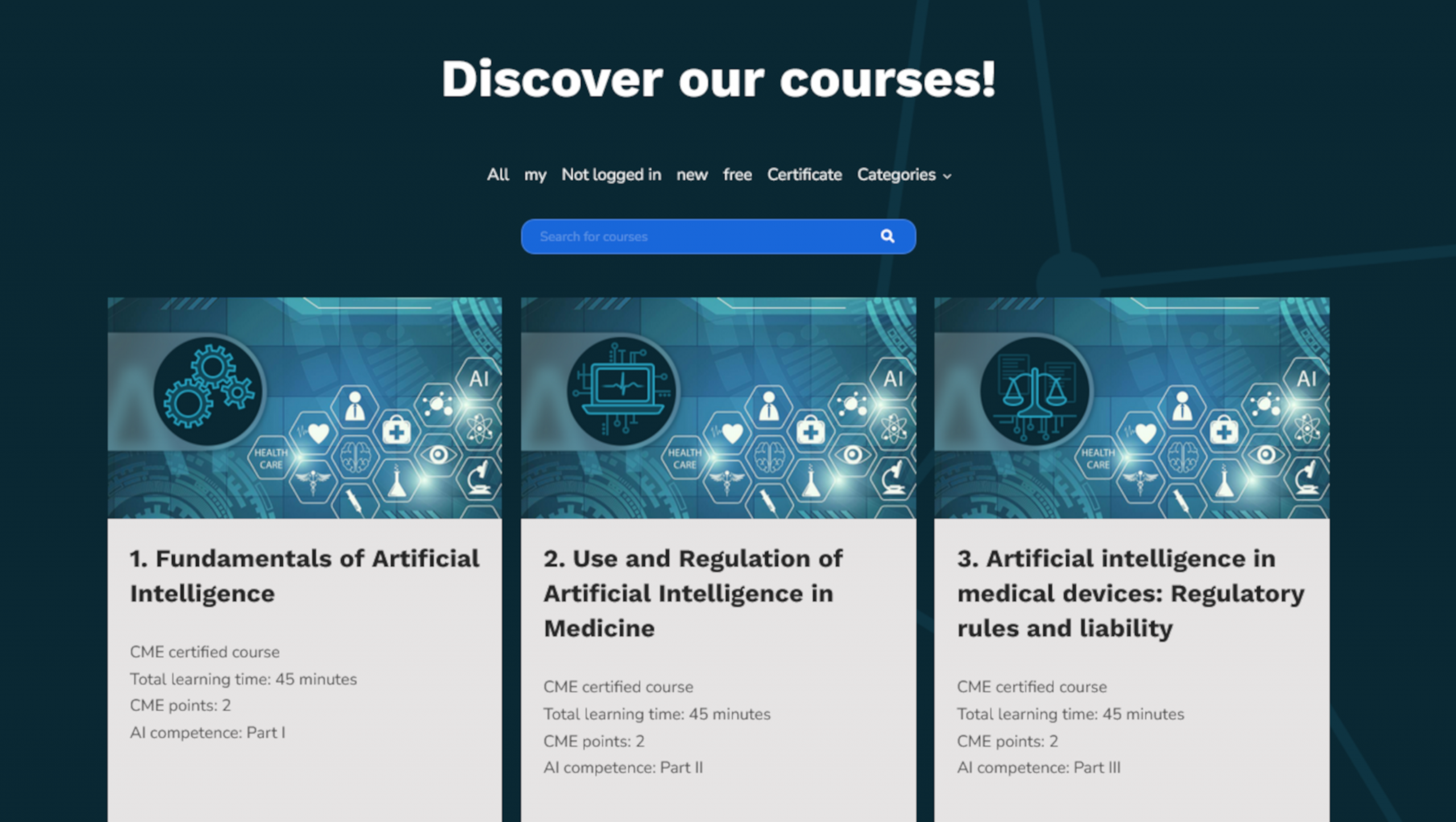 Courses 1–5 (including CME certification): Fundamentals of AI in medicine: how it works, data quality, bias & fairness, legal framework.